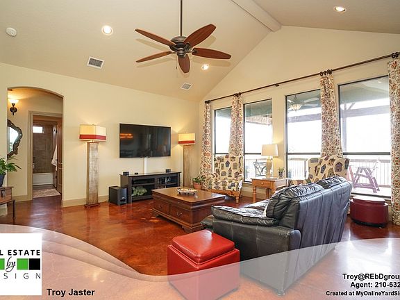 Enjoy elegant country living & hill country views zoned for Northside ISD! Custom-built on almost an acre in Valentine Ranch. Island kitchen w/granite counters, SS appliances, breakfast bar & gas cooking. Split-level Master w/stunning shower and private balcony. Gorgeous stained concrete floors throughout with open floor plan & soaring ceilings. Tandem 3-car garage. Metal roof and new 16' x 30' deck. Neighorhood amenities include park, spring-fed pond, playground, miles of trails, horse stables & corrals
