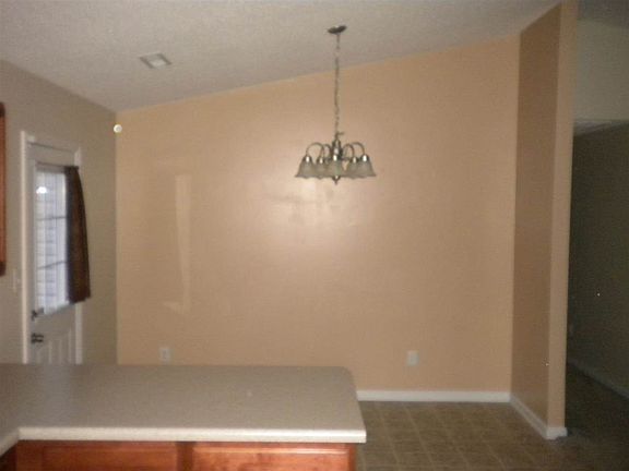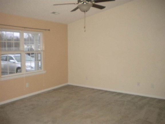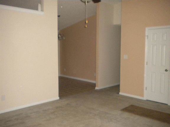 This home has a covered front porch on both sides of the front door. As you walk into the living room you see the cathedral ceiling which continues into the kitchen and dining area. The kitchen has a breakfast bar, dishwasher, microwave, range, and refrigerator. At the end of the kitchen is the laundry room. The small room has a one door closet, second bedroom has a double door closet. The master bedroom has a large closet and and on-suite bathroom. The door in the dining room leads out onto the patio in an unfenced backyard with a child's playset. The tenant is responsible for maintaining a half acre of this 1 acre lot. Septic system is using a hydraulic lift to pump to the back of the lot.