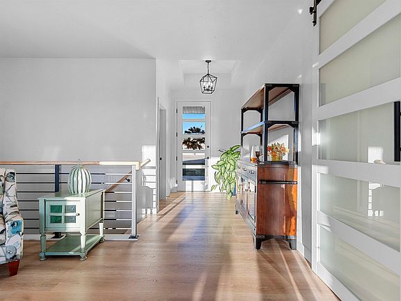 Contemporary and elegant feelSleek foyerOpen concept floor planOpen concept dining areaTile backsplashHuge butler pantryBarn door