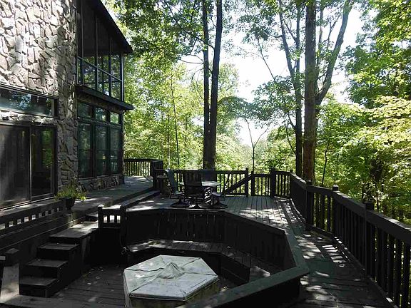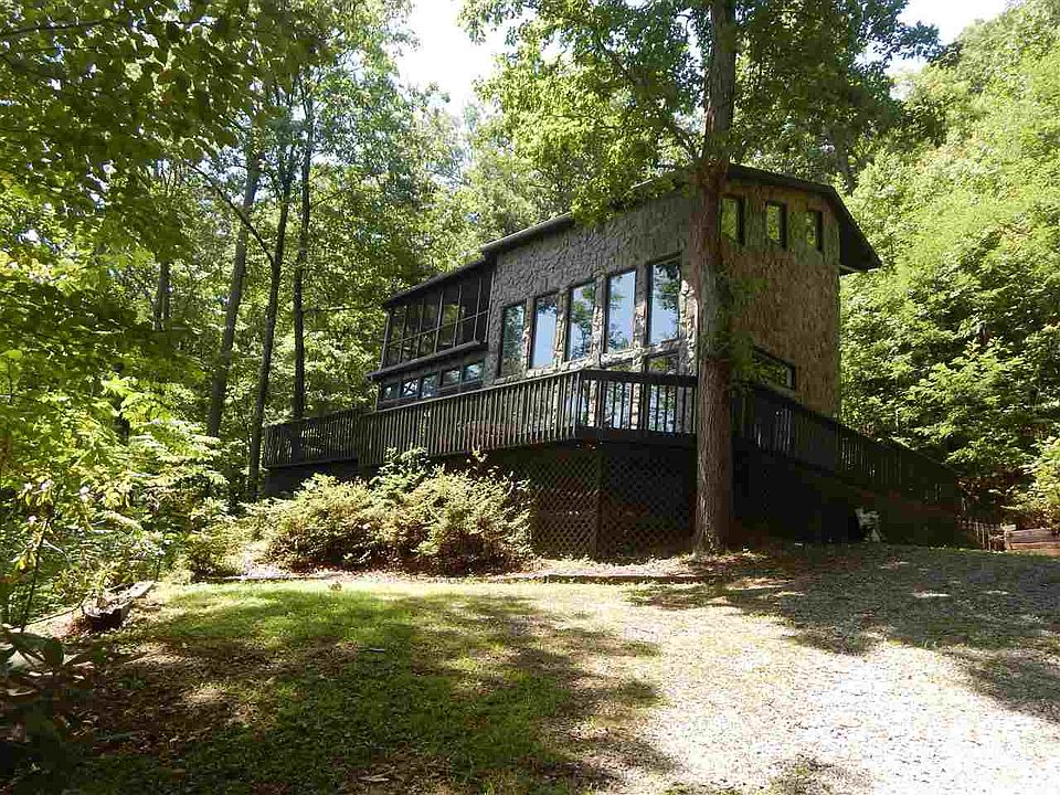 Very private & unique mountain property on 11.12 acres! Even has an old abandoned gold mine! Beautiful stone home built in '96 has lots of windows to enjoy winter mountain views and an abundance of nature. Home could actually be 3 bedrooms but septic permit is only for two. Lower level has LR with fireplace, Dining Rm, Kitchen, 1 BR or den, 1 BA & sunroom. Upper level has two bedrooms (one with screened porch, one with balcony), a large bath with jetted tub, double vanity & walk-in shower, and an open area near the stairs that could be used as an office. Lots of decking around home and a fire pit. Priced well below tax assessment - a must see!