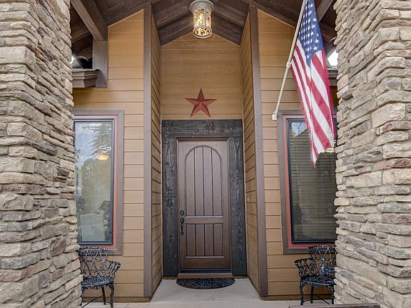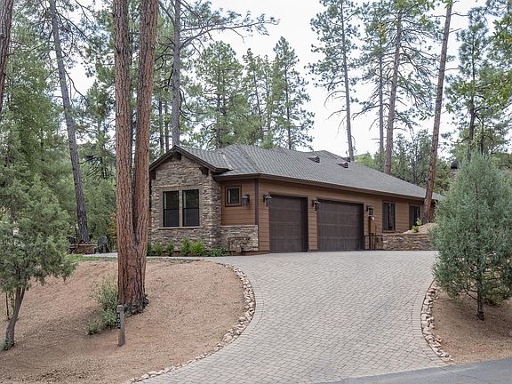 Stunning single level home surrounded by tall Ponderosa Pines. This gem is move in ready, all furnishings and artwork included, what you see is what conveys, including 6 TVs and outdoor furniture. Interior custom features include four bedrooms and three full bathrooms, concrete flooring, ten-foot ceilings, 8-foot Alder doors, gas & wood fireplace, beautiful gourmet kitchen, gorgeous granite with new appliances, craft ice, breakfast bar with eat in and formal dining option and wine fridge. Master bedroom has access to private covered patio, natural lighting throughout the home. The three-car garage is 980 S. ft. +/- with epoxy flooring, garage attic with plywood flooring, built in cabinets and ample storage. Exterior features: Fire Pit in the front entry, iron gate, landscaped with