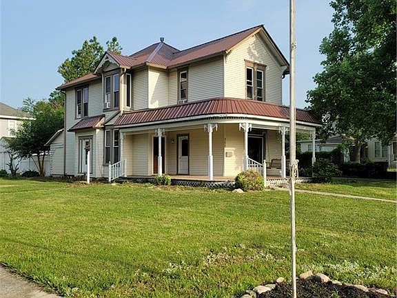 Take a look at this 2 story, turn of the century, Victorian style home featuring 5 bedrooms, 3 full baths, large eat in kitchen with numerous cabinets, hardwood floors, trim and moldings throughout, metal roof, 1 car attached garage, and a covered front porch perfect for those summer evenings. The bedroom on the main floor could also be used as a den/office, while the foyer area could be used as a hearth room. This home has endless possibilities! New this year: Main level shower, dishwasher, microwave, upstairs tankless gas water heater, main level tankless electric water heater, new interior paint in a majority of the home.