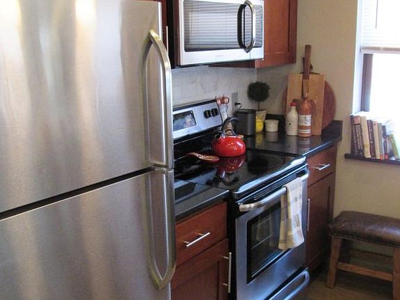 Available July or August! This large 2 bed features an open concept kitchen living. Beautiful black granite counters and stainless steel appliances. Breakfast bar. Kitchen is fully applianced and has a dishwasher and disposal. Hardwood floors throughout. Electric baseboard and split system air conditioning is wall mounted. Stunning full bath with tub. This is usable as a two bedroom but one bedroom is considerably smaller than the other. The master bedroom is enormous and can fit a full bedroom set no problem. Great for a couple who wants an extra room! Coin operated laundry being installed in the basement this summer. first, last, fee and a $150 cleaning deposit. July or August