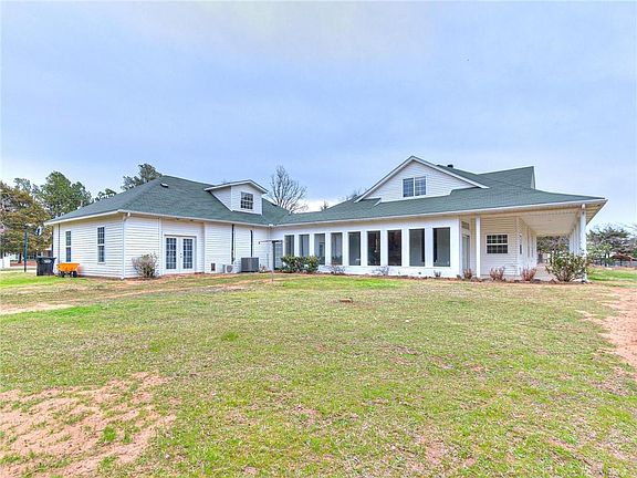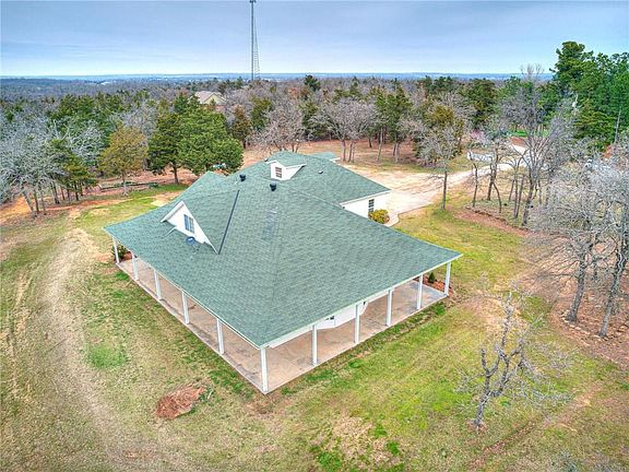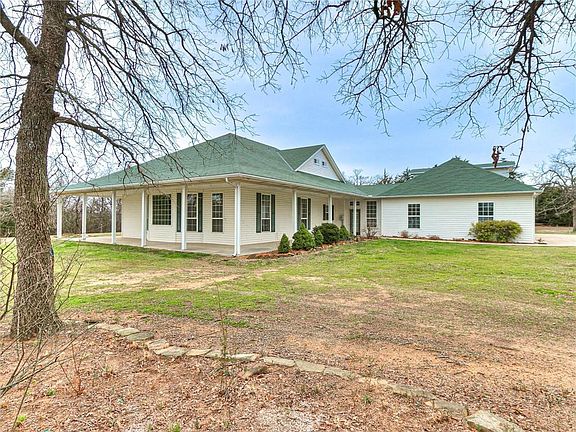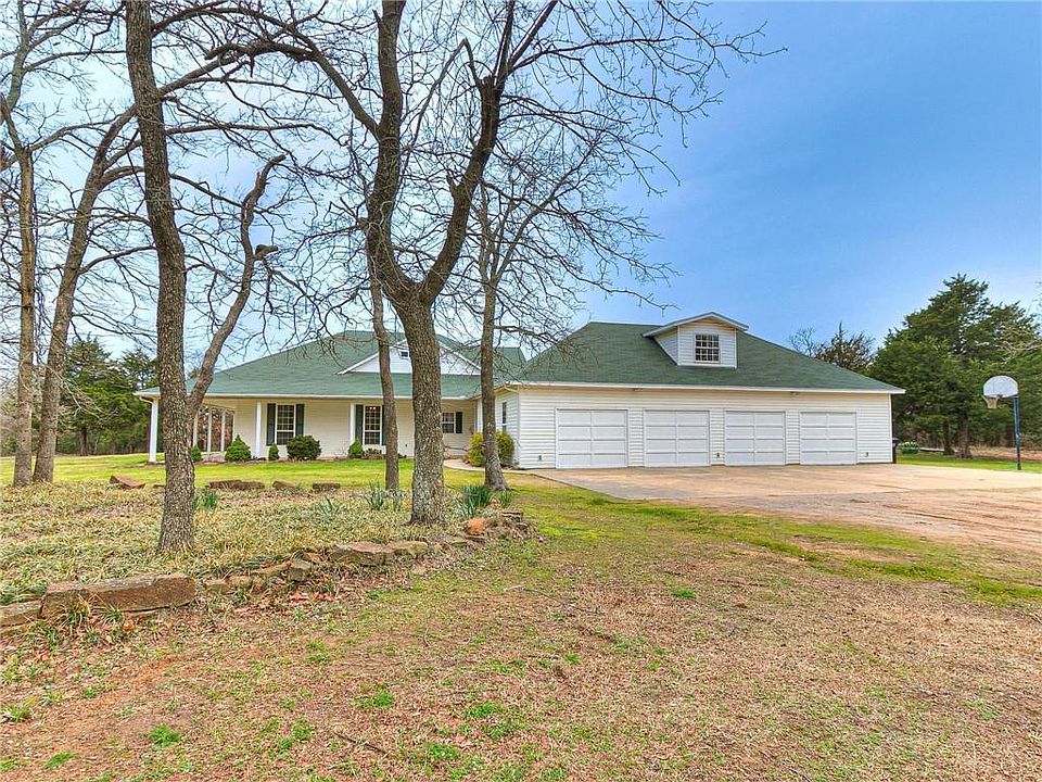 This beautiful contemporary ranch-style farmhouse features an impressive character-filled interior and offers well-proportioned rooms. The original 4 car garage has been converted into a fully functioning separate living quarters which includes the following. Two additional bedrooms, a flex space that can be used as a game room/theater room/exercise room/optional living room. A full bath with a walk-in shower and an upstairs bonus room. The kitchen has an enormous butler’s pantry, built in gas range, built in oven, built in microwave, built in warming oven, a farmhouse sink and herringbone wood tile floors. The living room has several built-in's, a cozy fireplace, and tons of natural light. The primary bedroom offers a huge walk-in closet with built-in's, an enclave shower, a freestanding tub, and plenty of storage for your linens. The home is conveniently situated in a quiet location in Pottawatomie County on 5 acres (MOL) just 3.5 miles north of I-40 highway junction.