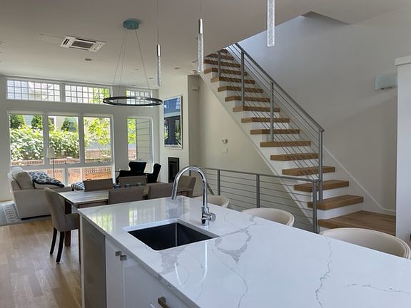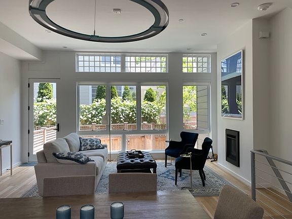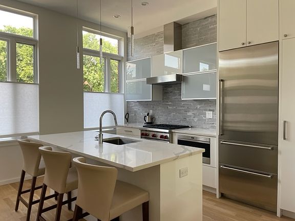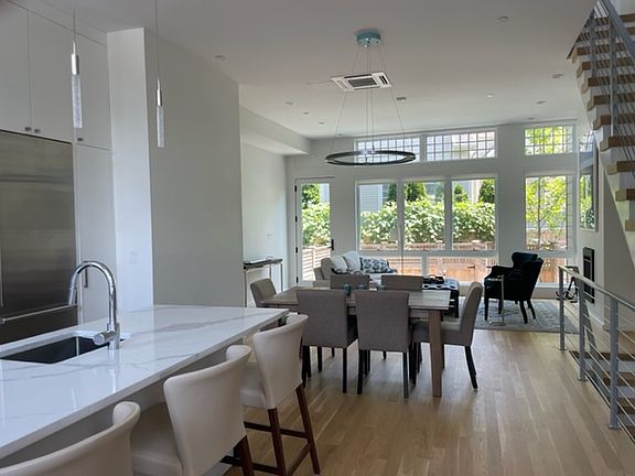 Cambridge Port ~ Luxury living at Row 300 in Cambridgeport, a collection of 7 high-end townhomes, one block to Whole Foods on River St., half a mile to MIT, Harvard, HBS, Sloan, Central and Kendall Squares. This light-filled 4-bedroom 2.5 bathroom residence, built in 2020, offers a stunning floor-through open plan living with modern sleek design, dramatic 11' ceilings and expansive floor-to-celling windows, front and back, overlooking the private fenced-in bluestone patio. The kitchen has a striking streamlined allure with European-style cabinets and an 8' island an ideal place to gather and converse. The 2nd floor features two bedrooms, one with en-suite bathroom, and a private 200 sf hide-away deck. The lower-level houses two additional bedrooms, a Jack and Jill bathroom, laundry set and storage. The 400-sf private lookout rooftop terrace, sheltered from the wind, offers a place to relax or take in beautiful vistas of the Boston skyline. One parking space. Available 8/1. Not accepting groups. Renter is responsible for gas, electricity and cable/ wifi. Snow removal and landscaping included. Not accepting groups of adults. Max 2 adults.