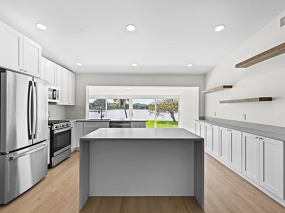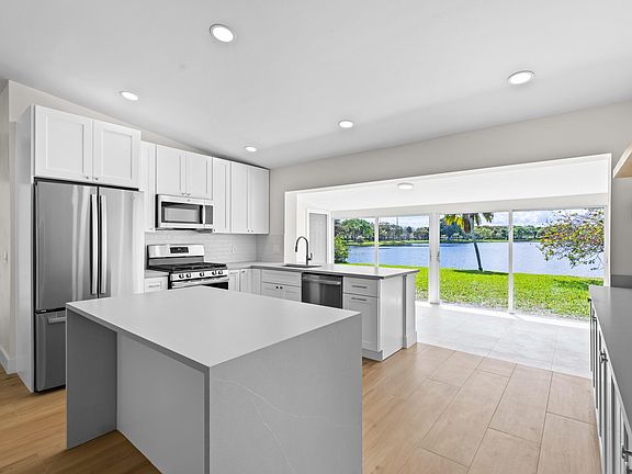 RARE LAKEFRONT HOME is truly a must see! Complete renovations just completed. Enjoy cool breezes off the water, wildlife out your backdoor & water views from every room. If the location isn't enough, the renovations are sure to impress. BRAND NEW roof, IMPACT windows & doors, large format wood-look PORCELAIN TILE throughout, kitchen with LEATHERED QUARTZ counters & loads of cabinets, designer quality bathrooms, SOLID WOOD shaker style doors, ALL NEW trim, paint, hardware & fixtures throughout. The extended master suite is the ideal flex space with one of the best views in the neighborhood. Other highlights include oversized 1-car garage, lakeside patio, natural gas for the range, clothes dryer & tankless water heater. Lake fed sprinklers keeps the yard looking good and water bills low.