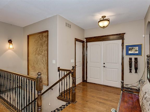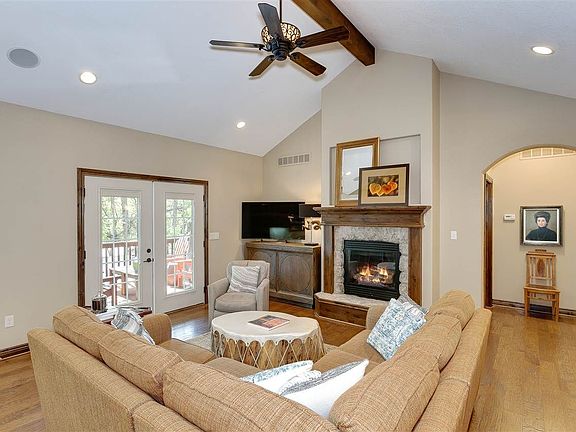 Custom built home with amenities galore. Second to last home built in Bel Riv. The entrance to the home has stained concrete, mature landscaping, double front door & recessed LED lighting under the eaves. Kitchen has oversized island, walk-in pantry & gas range. All appliances remain (refrigerator new 2018). Living has vaulted ceiling, gas fireplace, & French doors leading to oversized covered deck. All deck doors have retractable screens. Master has access to the deck & vaulted ceiling. Master bath has floor to ceiling tiled shower, double sinks, storage, jacuzzi tub & heated floors. Basement has wet bar with sink & mini refrigerator. Upgrades include hardwood floors, Knotty alder wood, tumbled stone, granite, wood blinds, surround sound, stained concrete flooring & central vac system. Oversized garage is finished with epoxy painted floor. Exterior painted in 2018. New roof May 2019. Agent is a licensed realtor in the state of Kansas.