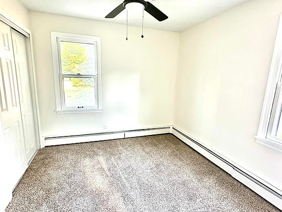 The bathroom has been completely updated with a new toilet, vanity, and vanity mirror. Closet updates include new slider doors, shelves, and hanger rods.