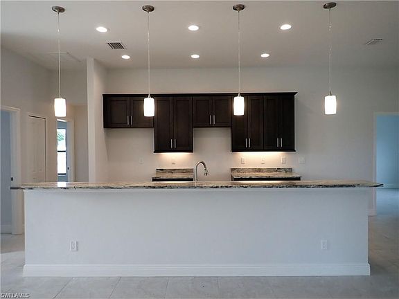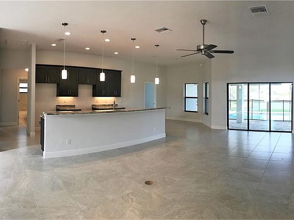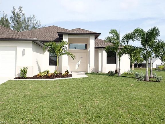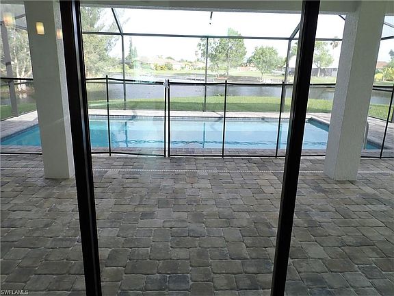 NEW POOL HOME under construction on fresh water CANAL, oversized point lot with SE intersecting canal view ready mid July--Located off Santa Barbara Blvd, not located in flood zone, flood insurance may not be needed. This 4 bedroom, 2 bath pool home has a great room design & all living areas plus master bedroom & rear bedroom have waterfront & pool views. Some features include tile floors throughout with carpet in all 4 bedrooms, 1990 sq. ft. of living area, granite counters in kitchen & baths, under cabinet lighting in kitchen, inside laundry room with deep sink. Screened lanai & pool (approx. 13x26) completed with pavers. The master bedroom has sliding glass doors out to pool area, 2 walk-in closets, dual sinks with separate soaking tub & walk-in shower. Stainless steel kitchen appliances: side by side refrigerator, smooth top range, dishwasher & microwave to be installed a couple days prior to close. Single hung Low E tinted dual pane insulated glass windows, 16 seer air conditioning unit, 2 ceiling fans, irrigation system, floratam sod & upgraded landscaping. **Some photos of similar completed model, please read text under the photos. Buyer to assume balance of assessments