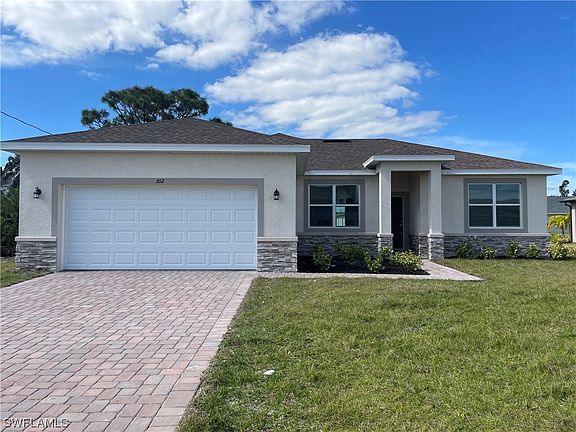 BRAND NEW CONSTRUCTION with builder warranty in highly desired Southwest Cape Coral. 3 bedrooms + Den/Office, 2 bathrooms, 2 car garage. 1668 sq. ft. under air with 9'4" ceilings throughout. Tile in every room. Granite countertops with matching backsplash in the kitchen and both bathrooms. Stainless steel appliances. Large walk-in pantry. Master bath has dual sinks, a ceramic tile shower, and a walk-in closet. All with plenty of room. Indoor laundry room. Brick pavers in the driveway, walkway, and lanai with brick accents on the front of the house. Professional landscape package. It's a Must See. Storm Shutters included. ALL ASSESSMENTS IN AND PAID! MOVE-IN READY NOW!