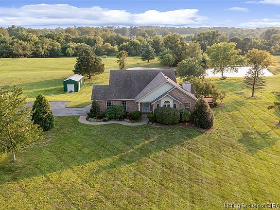 Nestled away in the peaceful community of Charlestown, IN, 15 minutes from Louisville! This 3 bedroom 2 bath full walkout-partially finished basement with a huge entertainment area, 2 finished rooms that could be an office, a workout room, and more! 3 Acres and a lake (the owner owns half, and the neighbor owns the other half. Look at the attached @ property lines). This home has been brought back to life with lots of love, including Painting and updating the kitchen, including gorgeous granite countertops, flooring throughout, basement, and more—2-car attached side garage. The prior owners had beautiful landscaping with many Rose bushes and much more! Convenient to interstate, restaurants, shopping centers, etc. But so quiet and off the beaten path. Don't miss this beauty! Open Thursday, 8/24 from 5:00-7:00