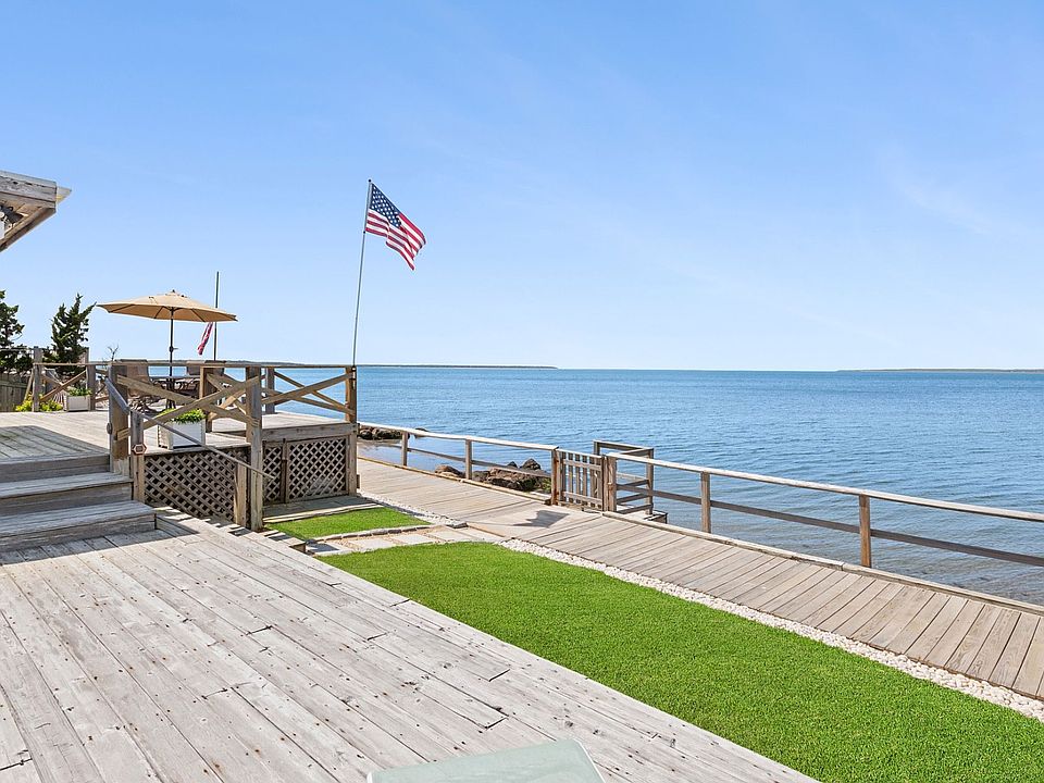 Located in Amagansett's idyllic bayfront community, Lazy Point, 302 Shore Road is the quintessential Hamptons beach cottage-ever coveted yet rarely available. Complete with nearly 80' of bulkheaded frontage along Napeague Bay's pristine waters where picture-perfect views are center stage from practically every vantage. Take in sunrises over Napeague Harbor's Hicks Island and sunsets out across the bay-on clear days, the views extend straight north, past historic Gardiners Island and all the way to the shores of Connecticut. The property includes a spacious wraparound porch leading directly to the water that offers ample space for sun lounging, dining al fresco, and convenient access to kayaks and paddleboards, plus several sections of lawn and a vegetable garden. There is a stairway leading down to your own white sand beach where you can wade out to an anchored boat or swim in crystal-clear waters. For seafood lovers, there is no fresher way than catching your own and these waters are teeming with oysters, clams, mussels, and all your favorite local fish. The home offers 1,150 +/- sq. ft. of living space with 2 bedrooms and 1 bath plus another 650 +/- sq. ft. in the partially finished lower level, adding another bedroom/flex space and bath. The entirety of the open-concept main living area enjoys water views and includes a large eat-in kitchen with breakfast bar and dining area that flows into the den at the rear of the home with sliding glass door egress. A charming, screened porch offers access from the living room and has a sliding glass door egress toward the water as well. Set down a short, secluded road with just 5 other residences, this home benefits from being privately owned, unlike most Lazy Point properties which are land leases from the Town Trustees. Enjoy a level of peace and tranquility rarely duplicated in the Hamptons, all while conveniently located with easy access to both Montauk and Amagansett.