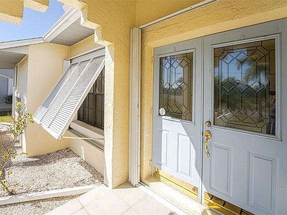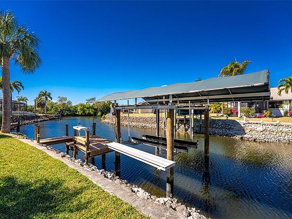 Welcome to 302 Singapore Road, a stunning WATERFRONT, GULF-ACCESS retreat tucked away on a quiet CUL-DE-SAC in the deed-restricted community of San Sebastian Harbor. This 2-bedroom, 2-bath home sits high and dry with NO FLOOD DAMAGE from Helene, offering peace of mind along with incredible water views and access. Set on 69 feet of water frontage along the Pompano Lagoon canal, this home provides quick sailboat access to Charlotte Harbor and the Gulf of Mexico. A true boater’s dream. With 1,414 square feet of thoughtfully designed living space, the home is filled with natural light, high ceilings, skylights, and tile flooring throughout, creating an open and airy feel from the moment you step inside. The tiled entry leads into a spacious living and family room, seamlessly flowing through French doors into the dining and kitchen area, complete with additional eat-in space. The remodeled kitchen features all-wood shaker cabinetry, stainless-steel appliances, Corian countertops with matching backsplash, and a pantry closet. Perfect for both everyday living and entertaining. The primary suite is a private oasis, offering double-door entry, sliding glass doors to the lanai, two walk-in closets, and a well-appointed ensuite bath with a walk-in shower, soaking tub, and dual vanity. The guest bedroom features wood laminate flooring and is conveniently located near a full guest bath. Step outside and embrace the Florida lifestyle. The screened lanai opens to an expansive patio that leads directly to your private dock, complete with WATER and ELECTRIC HOOKUPS, A FISH-CLEANING STATION, and a 10,000-LB ALUMINUM BOAT LIFT WITH A BRAND-NEW CANOPY COVER. Ready for your next day on the water. Additional features include a NEW ROOF (2023), A/C (2018),WATER HEATER (2018), and a 2-car attached garage with washer/dryer, storage, and workbench space. Lush landscaping and soaring palms create exceptional curb appeal. Residents of San Sebastian Harbor enjoy access to a community pool, pickleball courts, and tennis courts, all with low semi-annual HOA fees. Ideally located near historic Punta Gorda, shopping, dining, golf courses, beaches, and easy access to US-41 and I-75. This meticulously cared-for waterfront gem offers the perfect blend of comfort, convenience, and coastal living. Schedule your private showing today—this one won’t last.