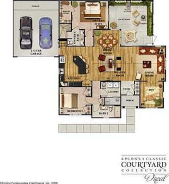 UPGRADED BUILDER'S MODEL HOME, MOVE IN READY NOW! Ducal floor plan with private outdoor Courtyard. NO STEPS! Single-story, maintenance free living. This open floor plan features 2 bedrooms, 2 baths, DOUBLE SIDED GAS FIREPLACE and private Den. The interior of this fully upgraded and sunny home features nine foot ceilings throughout & cathedral ceilings in owner's bedroom and living room. Dream kitchen has a Full Appliance Pkg, Granite Counters, Raised Panel maple Cabinets with Crown, Tumbled Marble Backsplash and Hardwood Floors! The roomy owner's suite has a walk in closet and double vanities in owner's bath. Other highlights include Handsome Hickory Hardwood Floors and Ceramic Tile Foyer & Baths, pre-wires for cable, phone and fans, see- thru gas log fireplace in hearth room, natural gas central heating, Brick Paver Patio with Fountain, Laundry ROOM, a large 2.5 car finished & painted garage with opener and storage. Community Amenities Abound...fully furnished clubhouse w/ health and fitness center, deluxe kitchen, billiards room, gathering room complete with flat screen TV, pool complex, and Veranda to watch the sun set over the pond and fountain. Homeowner's Assoc to cover exterior maintenance, landscaping, irrigation system & water, termite bond, amenity center and Home Owner's Insurance!
