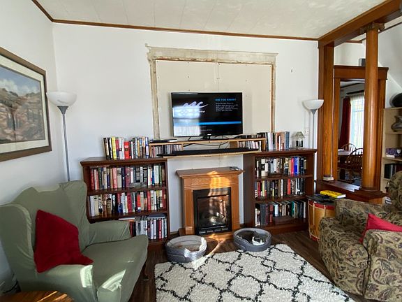 Architectural details still remain in this 1844 sq. ft. three bedroom home. Hard wood floors in kitchen, dining room and bedrooms. New kitchen installed 2021. Leaded glass details in living room windows. Two stair cases in the home with a stair lift installed on the stair case off the kitchen. Original built in hutch in dining room. Built in cabinets in full bath upstairs. New roof on house in 2010 and metal garage roof was new in 2020. Additional insulation and electric outlets were added to walk up attic in 2016/2017 for future use. Unfinished basement used for storage and has additional outside entrance. 22'x 22' two stall garage was built in 1985. Gas stove and fireplace were added in 2019. Seller offering basic Home Warranty.