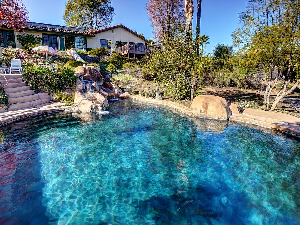 Sprawling hacienda style ranch with views to Palomar Mountain and beyond. Ideally located in the Winterwarm area of Fallbrook, this single story home was lovingly built with quality materials and a sense of timeless style. You'll find delights at every turn. Authentic wood-burning brick fireplaces. Vaulted wood beam and plank ceilings. French doors, picture windows and skylights fill the home with soft light that brings the outdoors in. Perfectly patinated Saltillo floor tiles. Brand-new carpeting and hard flooring just installed. Top quality, artisan grade, Spanish style tiles. Split floor plan with an expansive private master suite and sitting room/office. A second master bedroom with separate private entrance might be used for private guest accommodations or live-in help. EXTERIOR: Outstanding location. Set on over 1.2 acres of land just below the ridge top with pastoral eastward views, the home features a landscaped pool and spa area with a built-in tubular water-slide and unique water fountain perch. Expansive deck area adjacent to the great room is the perfect setting for relaxed outdoor living or grand entertaining. Yard areas, playground, family fruit tree orchard, small animal corral/kennel, gentle slope and more. A must see home.