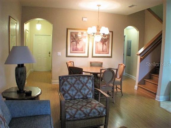 Outstanding updated 4-bedroom, 3-bathroom, fully furnished townhome with separate lockout unit, stainless steel appliances, granite worktops in the kitchen and all bathrooms, expensive wood slate California blinds fitted throughout the property, freshly painted interior, and spa bath in the master bathroom. Located in the sought-after community of Regal Palms Resort with the added advantage of being just across the way from the very popular Highlands Reserve Golf Course facility. The resort has 2 swimming pools, a lazy river, poolside bar, waterslide, beach volleyball court, an indoor and outdoor spa, steam room, sauna, fitness center, sports bar, restaurant, and play areas. Regal Palms is located just minutes from Disney and all of the local attractions. Within a short distance to a nearby Publix Supermarket shopping complex and restaurants. The property has laminate flooring fitted to entrance hallway, lounge and kitchen areas, wooded stairs and rails. In addition to basic common area maintenance, HOA Fees also include basic cable, phone, internet, exterior/interior pest control and lawn maintenance.