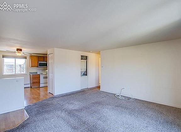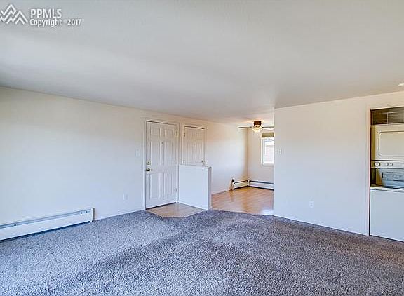 Location, Location, Location! Centrally located and just minutes from The Citadel Mall, Shopping, Restaurants, Downtown, Interstate 25, Peterson AFB and Fort Carson. Less than ?? Mile walking distance to Wal-Mart and the City Bus Line! Living Room and Master Bedroom both have amazing views of Pikes Peak and Cheyenne Mountain. This is the ONLY unit with four off-street parking spaces. Top Floor and on the End Unit. Updates from October 2014 including carpet, 3 Ceiling Fans, elevated toilet and (see supp rmks) top/down/bottom/up ???blackout??? honeycomb window coverings in both bedrooms and dining area! Updated vinyl sliding Windows. Screen doors in both entrances. Cable ready in the Living Room and master Bedroom. Washer/Dryer combo and appliances including the range, dishwasher, refrigerator and microwave ALL stay! Kitchen has a laminate wood floor, plenty of cabinets and a food pantry! There is a linen closet in the hallway. This unit includes storage locker # 6 in the common area of the building near the onsite pay laundry machines. HOA includes hot water, baseboard heat, trash removal, landscaping, snow removal and more! Great Income Potential or just Move Right in!