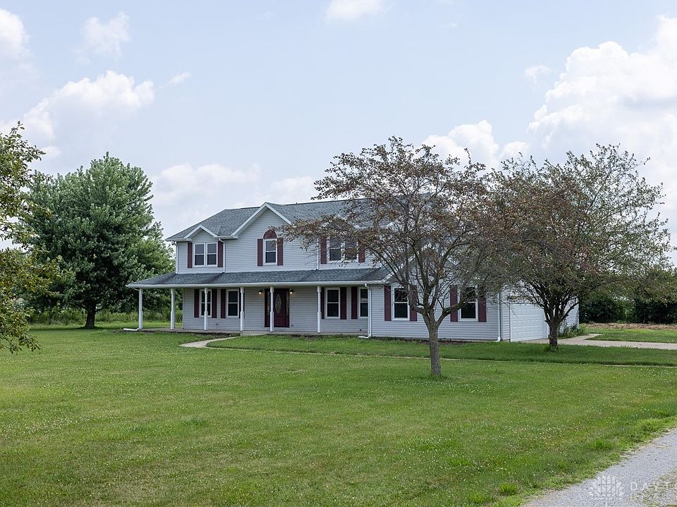 This beautiful two-story home, nestled on two acres, exudes charm with its wrap-around covered porch. Inside, you'll find four spacious bedrooms and four bathrooms. The large, well-equipped kitchen boasts Corian countertops and an island, providing ample space for culinary creations. This area seamlessly opens into the family room, which features an electric insert fireplace, creating a cozy atmosphere.