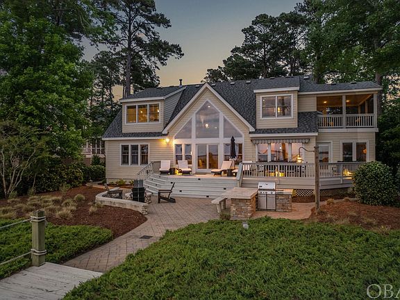 A soothing Outer Banks blend of class and coastal styles abounds in this Sound Front home awaiting your viewing pleasure at 3020 Martins Point Road. Located in Kitty Hawk just across the Wright Memorial Bridge in the gated waterfront community of Martins Point. This beautifully remodeled 4 bed 3.2 bath home backs directly up to the Currituck Sound. A meticulously landscaped oasis creates a serene and private feel as the long driveway meanders to the home. The large double car garage offers dry entry to the interior and an abundance of storage. A formal entry opens into a foyer with hall closet as the light golden toned Hardwoods and custom woodwork of the artisan stairwell flows into the many exquisite features such as immediate water views out of the floor to ceiling windows (UV Filmed) and a NC Stone and Slate Hearth with a gas fireplace that runs the height of the home.  The extensive wall of picture windows is accentuated by its vaulted ceilings and truly showcases its beautiful location. Many of the rooms from the custom kitchen, sunroom, screened porch and living room, to the catwalk leading to the office as well as 3 of the 4 bedrooms were designed with placement of home to nature in mind. The stunning waterfront views always remind you of what brings you here in the first place. solitude, peaceful vibes, water access and sunset views as good as they come.  An open flow home that also has a defined feel of individual spaces for privacy with its clever architectural design. A beautiful primary En Suite Bedroom with oversized bathroom, walk in tiled shower and walk in closet offers first floor living if needed. The top level features an open office space or lounging area, 2 More Bedrooms with full bathrooms as well as a fourth bedroom with a half bath (currently used as a secondary living space). From there its outdoor minded with the screened porch, sundeck and awning, custom pavers and built in grill area all with commanding water views leading to the 163 feet of private pier w/ boat lift and covered Gazebo allowing you to embrace the outdoor lifestyle we all embrace on the outer banks to the fullest. With Martins Point’s Marina, park and tucked away feel and security combined with this home being built around entertainment, you would be hard pressed to find a better prospective property to fulfill your outer banks home ownership dreams.