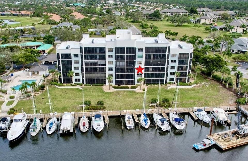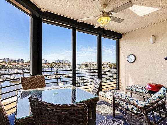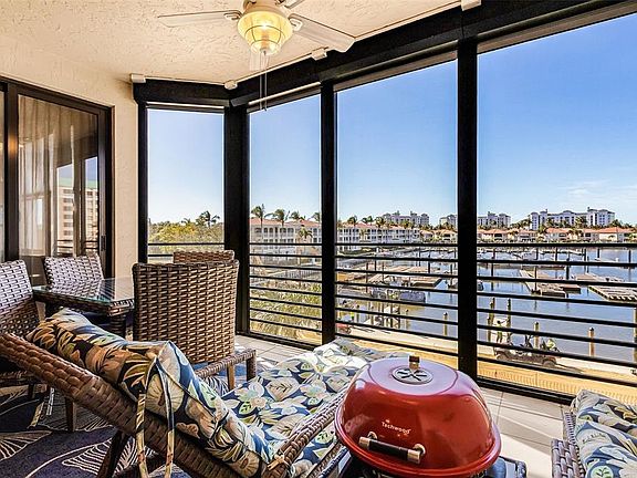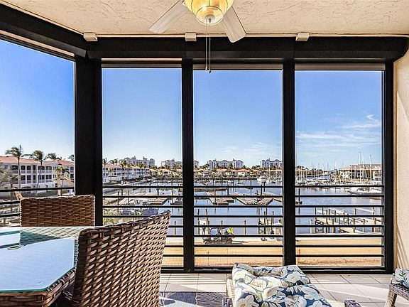 Enjoy a front row seat to the activities in the Marina basin! Watch manatee play, boaters come and go and brilliant sunsets in an ever changing mural. This building is one of the most desirable locations in the Marina and this unit is completely remodeled and ready to be your new Florida home. In this 3rd floor condo with 2 bed, 2 bath + den you’ll find a host of updates and timeless elegance. An outstanding kitchen in the center of the home has granite counters, hardwood cabinets, newer appliances and an open breakfast bar for easy entertaining. Even the chef can enjoy the view. The owner’s suite faces the water for sensational views and direct access to the screened lanai. Complete with a remodeled ensuite bath featuring a shower/tub combination and gorgeous cabinetry surrounding the granite vanity - you won’t need to do a thing here. An adjacent long walk-in closet offers amazing storage space. On the other side, the guest suite offers an updated bath with tastefully tiled shower and frameless doors, granite vanity and attractive fixtures. But the best part of the home is the deep and inviting lanai where you can relax with a cold beverage and reflect on why you love living here! When the weather turns, the lanai is protected with motorized hurricane shutters that close at the push of a button. Additionally, all windows and the lanai sliders have been replaced with a hurricane-resistant grade in 2025. Attractively furnished and complemented by plantation shutters and diamond set tile flooring in the main living area, you’ll be able to enjoy your new home right away! Plus you’ll have a dedicated carport space for your car. Make sure you come see why these condos offer so much value in location, design and features!