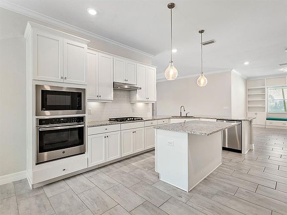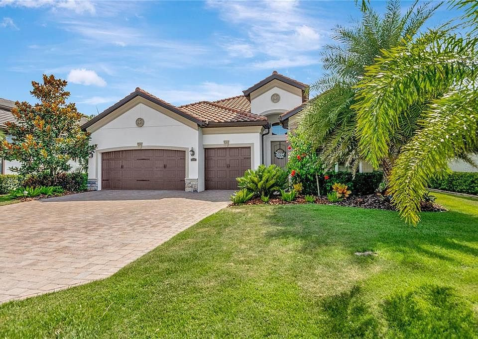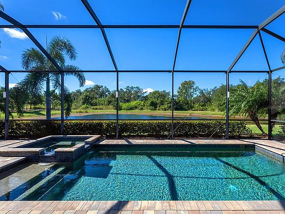 Stunning waterfront home in Arbor Grande. Welcome to this beautifully appointed Tivoli model home built in 2019, offering an ideal blend of comfort, elegance and modern design. On a premium cul-de-sac waterfront lot offering exceptional privacy and tranquil views surrounded by mature trees and lush landscapes. Enjoy a serene setting with no through traffic and proximity to Bob Gardner Park, a one-mile linear park featuring dog parks, paved nature trails, a gravity swing, playground, disc golf, soccer and baseball fields, and picnic pavilions. Inside the home, you’ll find a newly painted, spacious open-concept floor plan with 10-foot ceilings, crown moldings, tray ceilings, and plank tile flooring in a neutral greige tone throughout the main living areas. A wall of sliding glass doors seamlessly connects the great room to the screened lanai, creating an indoor-outdoor flow for entertaining. The lanai features a sparkling saltwater pool, heated spa, outdoor shower, a fully equipped outdoor kitchen with a stainless-steel gas grill and vent, refrigerator and LED color-changing pool cage lighting. The chef’s kitchen boasts white cabinetry, granite countertops with an expansive prep island, a suite of stainless appliances, including a gas cooktop, built-in oven and microwave, and a new dishwasher (October 2025). The eat-in dining area is conveniently off the kitchen, and a breakfast bar provides additional seating for casual dining. The flex space off the foyer can serve as a formal dining room or home office. The home offers four bedrooms and three full baths, including a spacious primary suite with tray ceiling and abundant natural light. The primary bedroom en-suite bath features a double sink vanity, large soaking tub and walk-in shower with beautiful neutral walls tiles and a seamless glass shower door. Bedroom 4 includes a Murphy bed and luxury vinyl plank flooring, ideal for guests or a home office. Bedroom 2 features a wood accent wall, and three bedrooms have new carpets, October 2025. Additional features include a laundry room off the kitchen with new washer and dryer included. Oversized three-car garage with Wi-Fi compatible openers, NEMA 14-50 wall charger for electric vehicles and wall organization racks. The stone paver driveway and pool deck, exterior stone accent walls and tile roof give this home a custom look. Residents of Arbor Grande enjoy many amenities within their gated community, including a lifestyle director, heated resort-style pool with lap lanes and heated spa, clubhouse with kitchen and gathering room, a fitness center, sand volleyball and bocce ball courts, community park and dog park, walking paths, and yard maintenance is included in HOA fees. See this resort-style living in one of the area’s desirable communities. It could be just what you have been looking for!