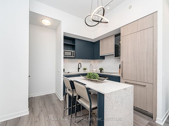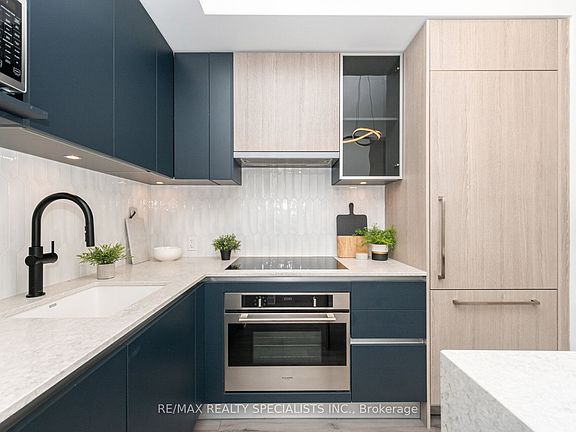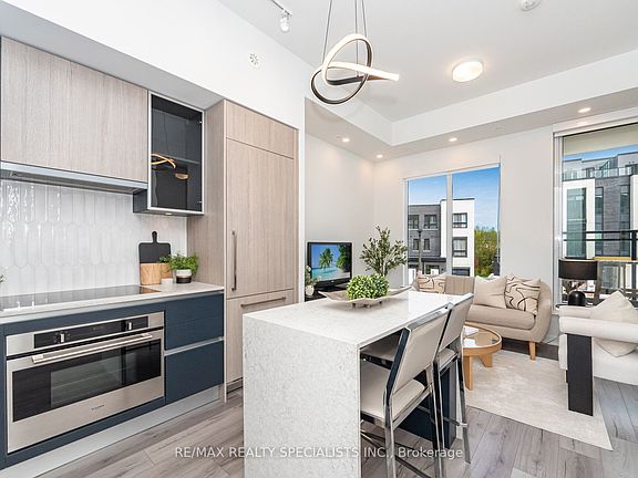 Step into modern living at District Trailside with this 2-bedroom, 2.5-bath stacked condo townhouse, featuring your own private rooftop terrace. Designed for both style and functionality, this home offers a bright, open-concept layout with a modern kitchen, living, and dining area framed by floor-to-ceiling windows that fill the space with natural light. A balcony off the living room and an expansive rooftop terrace make indoor-outdoor living effortless, complete with balcony and terrace furniture, and a full-sized gas barbecue. Perfect for summer gatherings. The kitchen showcases a quartz waterfall island, quartz counters and under-cabinet lighting. The living area features pot lights, large windows, and a walkout to the balcony, equipped with patio furniture. Upstairs, the primary bedroom offers floor-to-ceiling windows, a Juliette balcony, coffered ceiling, freestanding closet, and a 3 piece ensuite with a glass-enclosed shower, and a floating vanity. A second bedroom features large windows and a closet, with a four-piece main bath just steps away. The upper loft level includes a den area with access to the approximately 375 sqft rooftop patio, equipped with outdoor furniture, a gas barbecue and gas connection line. Located in the heart of North Oakville, with easy access to Hwy 407, Hwy 403, Trafalgar Memorial Hospital, grocery stores, shopping centres, and everyday essentials, this home is perfectly situated for urban living. Residents also enjoy premium building amenities including 24/7 concierge service, a fitness centre, party and meeting rooms, visitor parking, rooftop garden with seating areas, and a pet wash station.