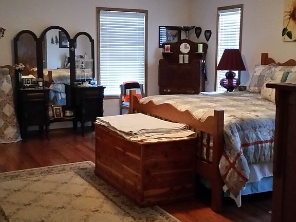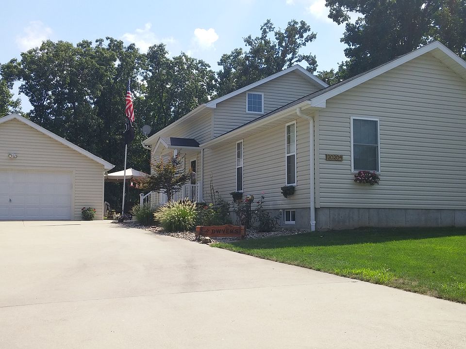 One and half story with basement and detached 4 car garage. Built in 2001 with master bedroom/bath and basement add on in 2012. Yard has sprinkler system, landscaped yard, own well and septic, maintenance free vinyl siding, thermal pane windows. Lake community. Central AC/Heat pump installed in 2012. Hardwood and ceramic tile throughout. Truman Lake area.