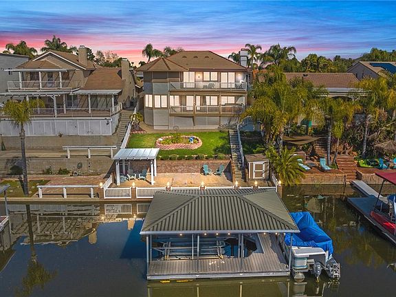 LOCATED ON THE EAST BAY OF CANYON LAKE! This home has its own private dock and boat lift! This cul-de-sac home has neutral paint and flooring throughout. A spacious family room with a brick-detailed fireplace and wet bar lends to a huge deck with multiple fans and a private jacuzzi. Just off the family room sits the kitchen with tile counters, an island, a peninsula with barstool seating, black appliances (including a trash compactor), a built-in desk area, recessed lighting, new Moen pull-down faucet, and dining room access through a pocket door. Three of the upstairs bedrooms, including the primary suite, have access to a spacious balcony that is complete with an automatic sun awning and automatic sunshades complement the back bedroom! What a perfect space for your morning coffee or to relax the day away! The primary suite also has a double door entry, a ceiling fan, plantation shutters, crown molding, multiple closets (1 walk-in), dual sinks + vanity area, jet soaker tub, separate shower, linen cupboard and access to a MASSIVE WALK-IN ATTIC (roughly 1500 sq. ft) offering tons of storage or an option to create an office or personal retreat! There are three additional bedrooms upstairs and a full bathroom. The dock is easily accessed off the main floor deck, down the stairs, past the tiered backyard, and through the lower entertaining deck/seawall, complete with a shed, that is perfect for housing garden supplies and tools! Canyon Lake amenities include a clubhouse, a private full-contact lake for boating, fishing, skiing, paddle boarding, and wakeboarding, 16 parks and beaches, an 18-hole golf course, community restaurants, tennis and pickleball courts, an equestrian center, baseball diamonds, and even a senior center. Beyond the abundance of parks and beaches in the community, Canyon Lake residents enjoy access to hundreds of acres of land to explore located off the North Gate. This preserved open space includes trails that are perfect for hiking, walking pets, riding horses, or bicycling. The community also offers concerts, spectacular firework displays, boating activities, and tons of community events. Living here is like being on vacation year-round!