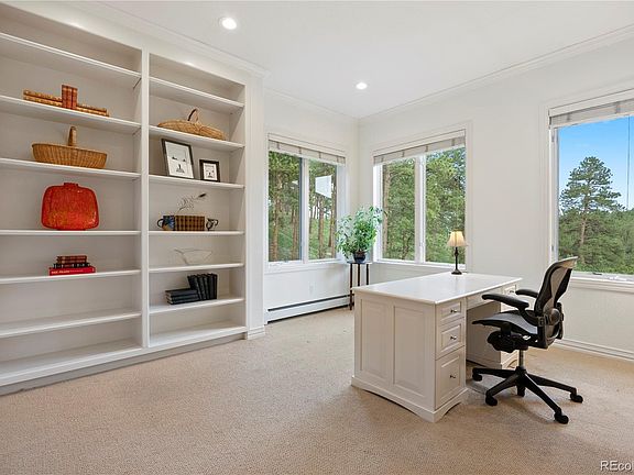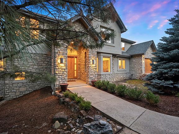 Classic Home in the Ridge at Hiwan! Near the end of a quiet cul-de-sac in the coveted Ridge at Hiwan, this stacked stone and stucco mountain contemporary sits on almost an acre of land that backs to protected open space and seems to go on forever. With mature landscaping, covered decking, flagstone walks and a playset, the home maximizes the outdoor living potential of its stunning foothills location. Inside, it features 6 bedrooms, 4.5 baths and over 5600 square feet of luminous living space. A charming stone archway leads to the entryway, and just beyond you’ll find a fabulous floor plan. The main floor features an office, music/sitting room and large formal dining room with lovely coffered ceiling. The generous open concept kitchen adjoins the great room and is flooded with natural light. New light fixtures and hardware throughout maximize the updated feel of the home, while new paint makes the whole house feel fresh. Upstairs you’ll find 4 big and bright bedrooms and 3 baths. The primary bedroom and ensuite face the open space for a spectacular view. The lower level walkout is sunny and bright and a dream for entertaining. It features a private guest suite and a large rec room big enough to host your friends for ping pong! You’ll also find an additional bedroom, currently used as a home gym and the most fun circus-themed playroom you’ve ever seen. Truly the best of both worlds, enjoy your quiet street, and walk to all the amenities of Bergen Park or hike into Elk Meadow Open Space. The award-winning elementary school is just a short walk away and its multiple athletic fields are easily accessible. The Ridge consistently draws homeowners with its unique lots, advantageous location and warm neighborhood feel. This home offers foothills living with every convenience, including the benefits of economical solar panels! The quick access to the I-70 corridor means commuters can get to downtown Denver in 30 minutes.