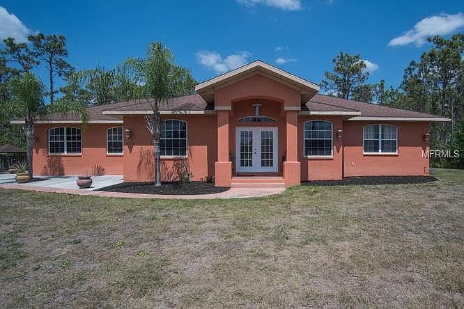 Come home to this gorgeous 3 bedroom, 2 bath 2 car garage country home located on a dead end street in the very desirable Saddlebag Trail Ranches located just east of Panther Ridge.With 5 acres of beautiful Pine trees and wild life right out your back door you will be proud to call this home. Upon entering this home you will find a large open floor plan with vaulted ceilings and a beautiful fireplace. The kitchen is open to the great room boasting solid wood cabinets ,island and breakfast Bar. You will fall in love with the master suite with your very own fireplace! Master bath is just right with dual sinks , spa/hydro tub with separate shower. You will enjoy relaxing in your screened Lanai over looking your large back yard. Plenty of room for a pool and barn! One look and you will fall in love with the serenity and peace of country living! As a added bonus with a full price offer owner will include his North Port Premium lot only 5 minutes to I-75 cable, electric, public water already done! This is a Great Investment opportunity! sell it or hold on to it! call me today!