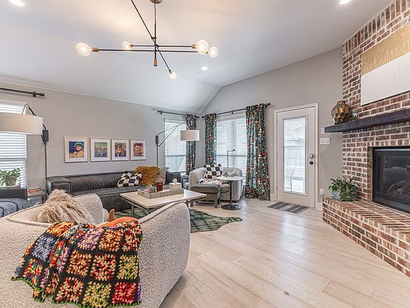 The open-concept kitchen features granite countertops, an oversized island, gas cooktop, and walk-in pantry, seamlessly flowing into the vaulted living room anchored by a striking brick gas-log fireplace. The primary suite is a private retreat, complete with dual sinks, a garden tub, a separate shower, and a walk-in closet.