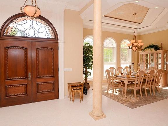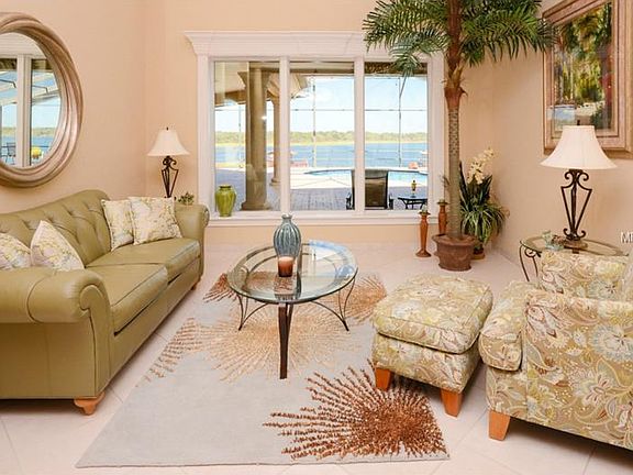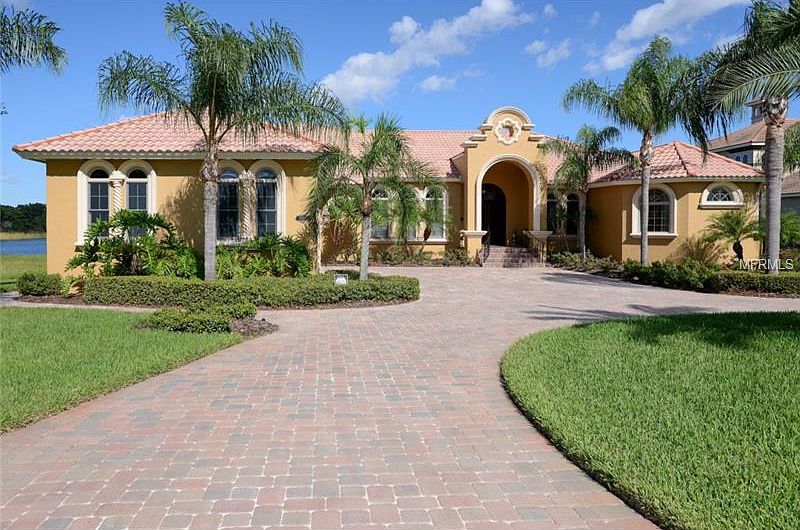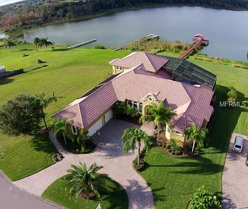 WATERFRONT WONDER - gorgeous one-owner custom home in gated community of Highlands by the Lake located on Banana Lake. This beautiful home boasts a range of upgrades seldom found in any home on three levels. 100% tile or marble flooring throughout (with exception of the media room), all formal rooms and master suite are on the main level. The kitchen boasts top of the line appliances, dual built-in refrigerator & freezer, dual built-in ovens, walk-in pantry and two islands for plenty of food prep space to accommodate the largest of gatherings. The oversized master suite has built-in bookshelves, a full seating area to relax in private and fully customized walk-in closet PLUS the adjacent master bath rivals any high-end spa resort. All bedrooms have adjacent private bathrooms and large closets. Other rooms include a private office/study with built-in partners desk and bookshelves, game room with full wet bar and a media room with full 8 person seating with all AV equipment included! Recently repainted exterior and the pavers the circular driveway, lanai, pool deck and upstairs balcony all recently cleaned and sealed. The two story pool screen enclosure and large "L-shaped" lanai and upstairs balcony afford unrivaled views of the lake beyond. The private dock provides access to one of the few recreational lakes in SE Lakeland that allow for boating and skiing. This magnificent beauty truly has something for everyone . . . . could that someone be you?