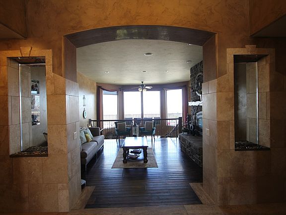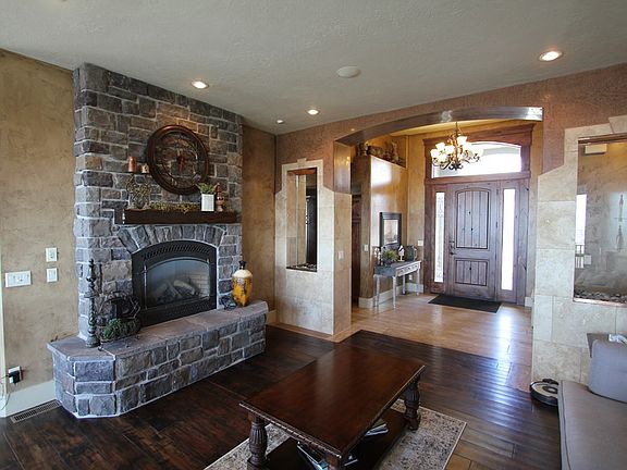 Views Further than you can see. This elegant ranch style home has all to offer on the main floor plus a full recreational basement. Home features flowing water walls, mechanical blinds, multi-source whole house audio, 3 fireplaces, spiral suspended stair case and Venetian plaster in 20' high atrium area. 9' base ceilings with 11.5' master bedroom tray, 12' entry, and 10' living room ceilings. Kitchen boasts walk-in pantry, double ovens and decorative hood/vent. Dedicated Theater room with reclining stadium seating and High Definition Projection system next to bsmt. kitchenette. Large covered maintenance free deck with rod iron railing, hard coat stucco exterior. All fenced yard with RV pad, firepit area, sunken trampoline, and mature landscaping.