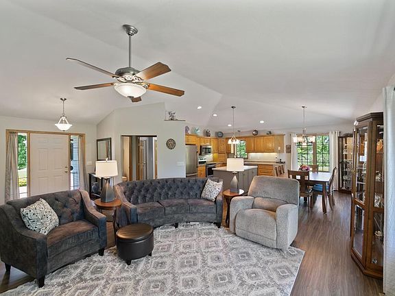 Experience luxury and tranquility in this custom-built home on a private 2.5-acre wooded lot with a serene pond. Vaulted ceilings enhance the home's grandeur, complemented by an elegant kitchen with oak raised cabinets and stainless steel appliances. The spacious primary bedroom offers a private sanctuary with a sophisticated tray ceiling. The walk-out lower level, plumbed for a wet bar and featuring a cozy gas fireplace, is perfect for year-round entertaining. This meticulously crafted home includes three bedrooms, three bathrooms, and a walk-in closet for ample comfort. Enjoy expansive outdoor living on the large maintenance-free deck and patio surrounded by perennials. The three-car heated garage provides ample vehicle space with a workshop area and surround sound, ideal for added convenience and entertainment. With abundant storage solutions and an additional shed, this home combines luxury with the peaceful ambiance of nature, creating an unparalleled retreat.