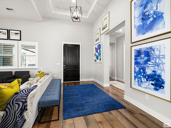 Welcome to your dream home in the beautiful Carmella Ranch Estates, where luxury meets comfort and breathtaking mountain views await you.This home offers an exquisite blend of elegance and modern living, designed to meet the highest standards of sophistication. Upon Entering, you are greeted by soaring ceilings and an abundance of natural light that flows through the expansive open floor plan., The kitchen features top-of-the-line stainless steel appliances, custom cabinetry, a spacious island, and elegant quartz countertops. The adjacent formal dining room and inviting living area with a cozy fireplace make this space perfect for both intimate gatherings and grand entertaining. The master suite is a true sanctuary, with a private balcony featuring panoramic mountain views, a lavish en-suite bathroom with a soaking tub, dual vanities, and a walk-in closet that rivals a high-end boutique. The additional four bedrooms are generously sized, with two offering en-suite bathrooms, ensuring comfort and privacy for family and guests. Step outside through the six panel accordion sliding glass door to your private oasis, where you will find a beautifully landscaped backyard complete with a covered patio, built-in BBQ, family sized hot tub and beautiful views of the valley and mountain backdrop. The Clubhouse community offers a gym, BBQ for parties and/or gatherings, and large pool and hot tub.