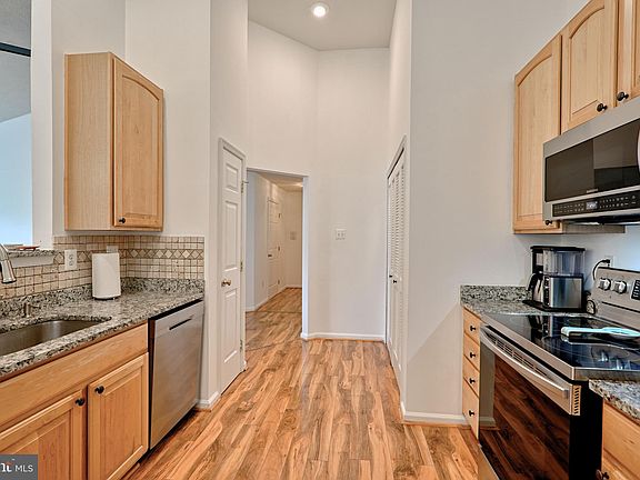 Rarely available, top floor condo at Buckingham Condominiums at New Town, Owings Mills. Excellent, clean, turnkey condition. High ceilings. Hardwood floors throughout. Updated granite countertops. Stainless steel appliances in kitchen. Recently painted in neutral colors. Third floor condo gets lots of natural sunlight and has an outdoor deck/balcony. Owner's suite has large, walk-in closet and full bath with standing shower. Second spacious bedroom located on other side of unit for maximum privacy, also features full bathroom, with tub shower. Guest access to this bathroom via entry foyer. Laundry closet conveniently off the kitchen w/full size washer and dryer. Secured entrance to building; ample parking directly in front of building. Walk to multiple amenities, including Central Park, community swimming pools and tennis courts, as well as hiking trails, coffeeshops, and New Town shopping center. Minutes away to downtown Owings Mills, hundreds of restaurants, Metro subway rail and major commuter routes.