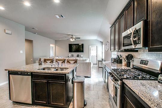 VACANT & READY FOR IMMEDIATE MOVE-IN! Easy access to walking trail. Covered patio, Bright open floorplan! Kitchen with Granite Counters, Recessed Lighting, Breakfast Bar, 42 inch Cabinets & Stainless Refrigerator included, SS Gas Range & SS Dishwasher & SS microwave. Functional Split floor plan for privacy. Master Bath w/Separate Shower & Double Sinks, + Huge closet. Ceramic tile floors. Washer/Dryer Hookup. Security cameras. Light/Garage Control Panel. Not pet friendly. Furniture not included. See requirements below. REQUIREMENTS INCLUDE: - Must be Deposit and First Month Ready - 600 or above credit - No evictions within the past 12 months - Clean Background Check - No smoking Renter pays for utilities. Renter is responsible for upkeep of the yard. No smoking allowed. Not pet friendly. Home has washer/dryer hookups.