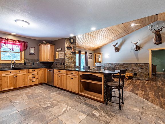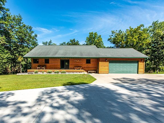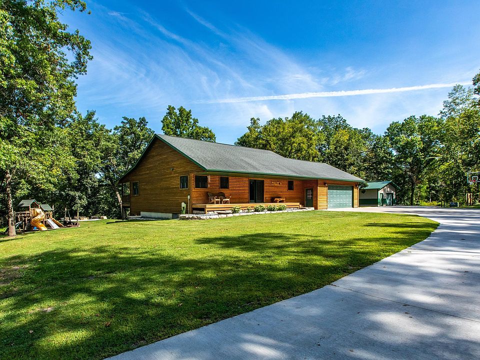 This beautiful constructed custom built log sided home has it all just 2.5 miles from downtown Rushford. Situated on a private mostly wooded 23 plus acres with mostly untouched woods, beautiful views, and your own trails to explore. This home offers everything you've been looking for including 5 bedrooms, 3 baths and 2 car 728 sqft attached garage. Its main level bedrooms include a private full bath, whirlpool tub, and separate shower and a huge walk-in closet. Enjoy the sunrise or sunset in quiet solitude from the front porch, deck or patio area! There are boundless opportunities to hunt trophy deer and turkeys in the woods of these 23 acres. New concrete driveway on the top and new outdoor fire pit to enjoy the evenings. This type of property does not last long, call for a showing today. Storage unit sold separately for $150,000. Approximately .6 acres.
