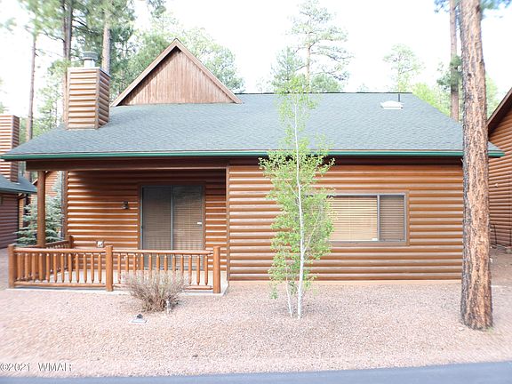 This 2006 4 bed / 3 bath log sided cabin in the pines offers a gorgeous open floor plan with the Master Bedroom being downstairs. There's a 2-car garage too. Hardly lived in by the 1 owner since being built - everything in great condition. Gorgeous fireplace in the vaulted great room, covered back patio for relaxing accessible from Great Rm & Master Suite. There's a room/office upstairs amongst the other 2 bedrooms that could easily be converted into a 5th bedroom (needs closet) or use as an office / den. 50 gallon electric hot water heater, Natural gas central heat and central A/C too. Beautiful trees surround the cabin. This is a freestanding site built home but in a Condo Association. Smaller yard but the HOA maintains. Enjoy the cooler weather of Pinetop. Make an offer.