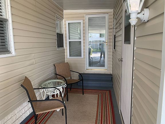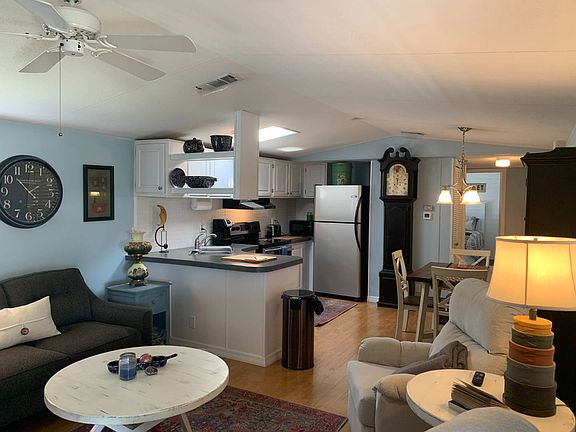 This is a mobile home for sale in a gated, pet friendly, 55+ community on a rented/leased lot. Check out this popular split 2BR/2BA model with a side set all season room and a shed. It has been completely renovated and comes furnished/turnkey. This 14 x 56 Fleetwood model has two master suites. The 2020 A/C, new insulation/membrane and ductwork keeps it all cool! This home lives large with a living room and eat in kitchen area combination with laminate floors and custom paint and an enclosed 12 x 13 all season room. The kitchen has been updated with newer cabinets, counter tops and stainless/black appliances including a refrigerator, stove and dishwasher. There is ample storage including a pantry. The open floor plan has laminate flooring throughout. There's a sliding barn door to the the carpeted all season lanai with vertical blinds.. One bedroom has custom ship lap paneling, a closet and a bathroom en suite (with hall access), a single sink vanity and a walk in shower. The second bedroom has custom board and batten paneling, bay windows and a bathroom en suite with a single sink vanity and a walk in shower. The shed houses the washer/dryer (included in the sale) hookups along with a second shed for extra storage. The lot rent is $817 and includes lawn mowing, edging and blowing along with the community amenities below. Ridgewood Estates is a well maintained GATED community with 2 heated pools, a hot tub, shuffle board & tennis courts, horseshoe pit, pool side club house with a library, fitness center & billiards room. There is a large "event" center used for many HOA sponsored events. Cards, Bingo, Chair Volleyball, water aerobics....just to name a few!