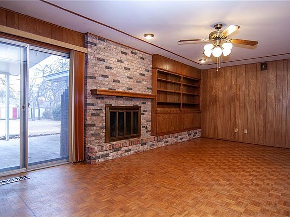 Nice ranch style home with HUGE back yard.The covered patio is a breath of fresh air to drink that morning coffee.Two living areas with cozy fireplace and builtins.A desk and hutch in kitchen to work from home or pay those household bills online.Main bedroom with walk-in closet,dual sinks ceiling fan and shower.Bedroom # 2 has built-in shelves and desk.Bedroom #3 has ceiling fan and nice closet.Big front porch ,trees, guttering and spacious utility room .Close to food,fun and shopping. Home being sold "AS IS" with no repairs but has newer HWT,Air,Roof .. Fridge reserved