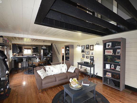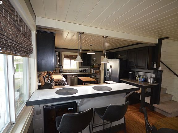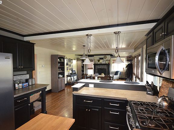Tastefully updated farm-style home with views, privacy and total comfort. Relax in front of the cozy fireplaces and enjoy the views or prepare meals on the gas range in your step-saver kitchen with all SS appliances, there's a wine cooler built into the breakfast bar. There's tile in the guest bath, but the icing on the cake is the master suite with tile shower and separate tub and style everywhere. Some furniture could be negotiable. Great, oversized garage/shop that's partially insulated.