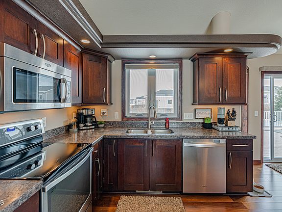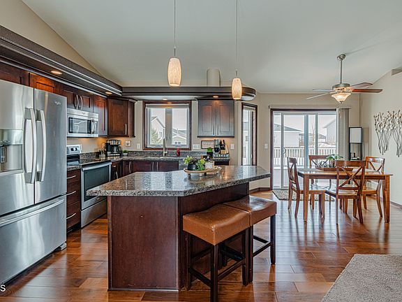 Move in Ready and Well Maintained 4 bedrooms 3 bath home located in SE Mandan. Custom Kitchen offering cherry cabinets, pantry, HD countertops and island. Open to the living and and dining room this home offers plenty of space for entertaining with family and friends. Patio doors off the dining room lead to a newer maintenance free deck , fully fenced yard w/ sprinklers and an above ground POOL that is included. Nice sized primary suite w/ full bathroom and walk in closet. Additional guest bedroom and main floor bathroom complete the main level. Downstairs you will find a spacious family room w/ gas fireplace flanked in beautiful stone. Two additional nice sized bedrooms, full bath and separate laundry room w/ cabinets. Triple garage is insulated and sheetrocked w/ heater , floor drain and water. Don't miss out on this gem. Call today!
