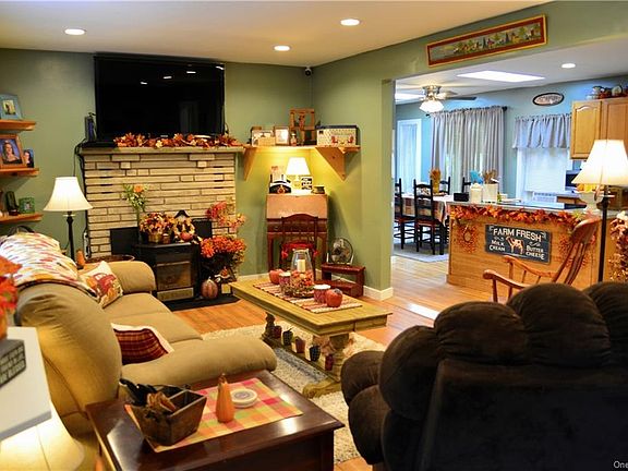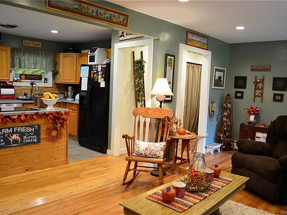 Well maintained home in super convenient location, adjacent to the 100+ acre Stone Ridge Orchard! The main residence features openly adjoined living, kitchen and dining areas with slider to a stunning patio large enough to accommodate outdoor dining and plenty of room to relax and enjoy the privacy of the green backyard. Beautiful hardwood floors throughout, skylights in dining/kitchen rooms, and a heat-assist pellet stove insert in the living room brick fireplace. Two bedrooms, bath and laundry room complete this 970 sq ft one level home. Above the two car garage is a 440 sq ft one bedroom apartment with kitchen and full bath. It is welcoming and bright, with Pergo flooring and a separate entrance. This property is a great investment for someone who is looking for rental income, or owner occupied with rental income or separate office space. Convenient to the Stone Ridge shopping plaza, minutes to High Falls, the Co-op and restaurants, and close to all Rondout Valley attractions