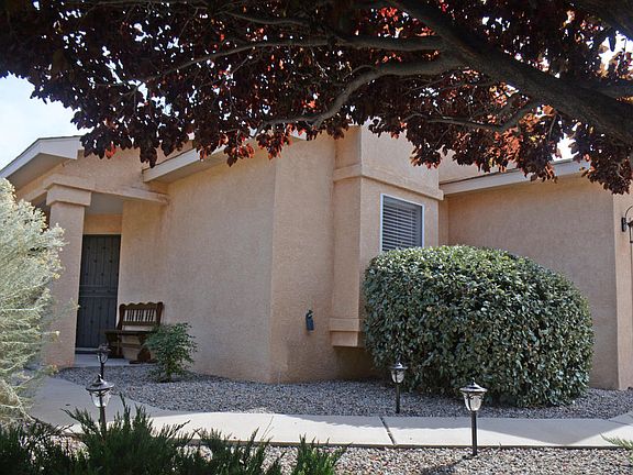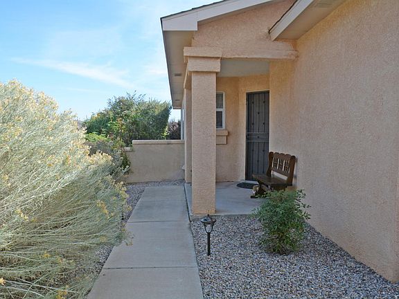 LOVELY Quiet CORNER LOT Many updates , NO POLY, Built-in Custom Nicho, New PAINT, FIXTURES, Gorgeous Porcelain Tile Flooring Accents this wonderful Open Floor Plan.Lots of Natural Light, Features Skylights and NEW COACH LIGHTS on Exterior, Great RIO SCHOOLS! This Beauty offers 3 Bedroom and View of Sandia Mountain Range from Covered Patio! HOA takes care of front Landscaping and Watering! Just a Cute Home!! Cozy, Warm and INVITING! Seller may help with buyer Closing Costs.