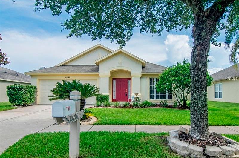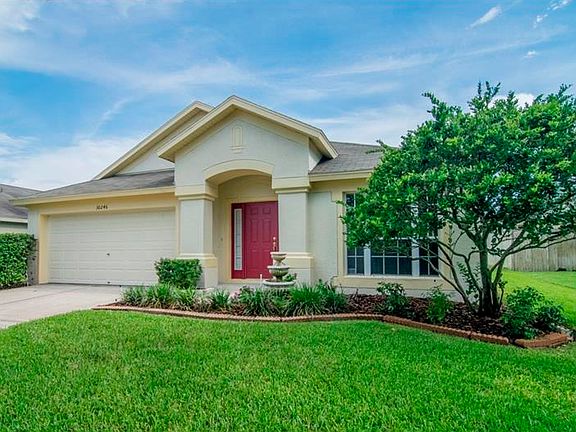 Don''t miss out on the opportunity to live in the gated neighborhood of Glenham in Meadow Pointe! This spectacular 4 bedroom/2 bath/ 2car garage home won''t last long! This home is very well maintained and in great condition! Upon entering you will notice the vaulted ceilings, beautiful plant ledges, decorative ceiling fans and gorgeous laminate wood floors. Natural light pours in from the windows as you make your way through the home. The kitchen open to the living room includes wood cabinets, closet pantry, recessed lighting, built in desk and eat in space. The vaulted ceiling and decorative arches also continue into the kitchen and living room area. The master bedroom is split from the other secondary bedrooms and includes a large walk in closet laminate flooring, vaulted ceilings and great wall space for furniture. A spacious bathroom with separate dual sinks, vanity area, large shower and garden tub finish off this master suite. The sliding doors from the living room open to a very large concrete slab set up and ready for your patio needs. A large backyard with palm trees and fenced across the back and one side makes this space perfect for all your outside enjoyment. An attic access ladder in the garage with attic fan and reclaimed water are also included. Access all the Meadow Pointe community amenities when purchasing in this section (pools, parks, playground, fitness, etc). Enjoy the low taxes (tax estimate includes CDD fee and 1 owner homestead) of this Pasco county home. Don''t miss out!