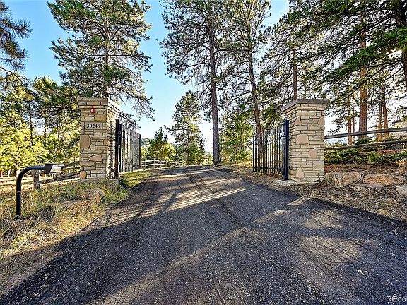 Welcome to this rare main-level living custom ranch home nestled on a serene & gated 5-acre property. Every luxury and thoughtful detail is yours in this exceptional home. Built of gorgeous stone, the home includes whole house air conditioning, radiant in-floor heat throughout, heated patios, geothermal heat, fire suppression system, snow melt system, backup generator, full water filtration & much more. From garage to kitchen to primary suite, you have main level living - a highly coveted feature in a foothills home! Step inside and be greeted by an open gourmet kitchen. With its brick & stone accents, granite counters, commercial range, newer appliances, & island with prep sink & plentiful seating, this kitchen is delightful. Adjacent is the spacious dining area and access to the large sunny deck with new Trex decking. Outdoor living abounds with a custom stone fire pit & hot tub area on the heated terrace below, an amazing place to enjoy an evening under the stars! Hardwood flooring and a stone fireplace in the great room create an inviting ambiance.The primary suite offers a spa-like experience featuring a gas fireplace, and a rain & steam shower. Downstairs, you will find a huge walk-out family room with stunning fireplace, 2 bedrooms & 2 baths, & abundant storage. High speed Xfinity internet too! And don’t forget the incredible huge 36x48 detached outbuilding/garage with power, plumbing, and bathroom built to hold a large RV (with outside dump station) & additional cars, and a gigantic loft with windows, to be completed as you see fit. This is in addition to the heated 3-car attached garage. House and Outbuilding are full stucco (mortar) and stone. Your gated 5 acres has a lovely views from the home, or take in the quiet forest feeling on the remainder of the property. It's all yours - the perfect balance of privacy, luxury and an incredible number of thoughtful amenities that are hard to find. And it’s just 10 minutes to downtown Evergreen and amenities!