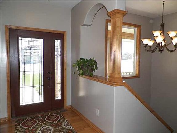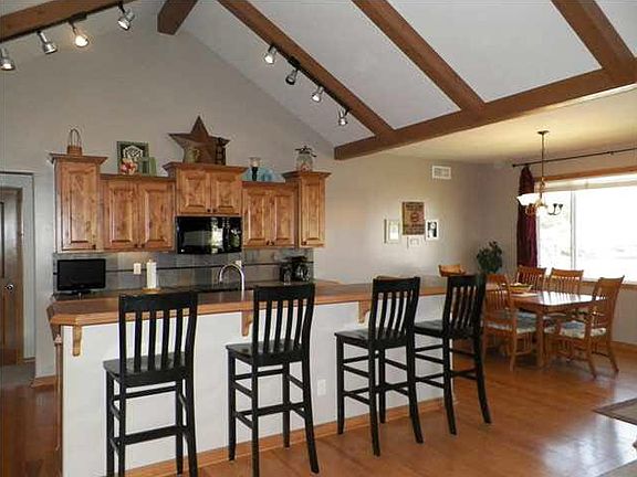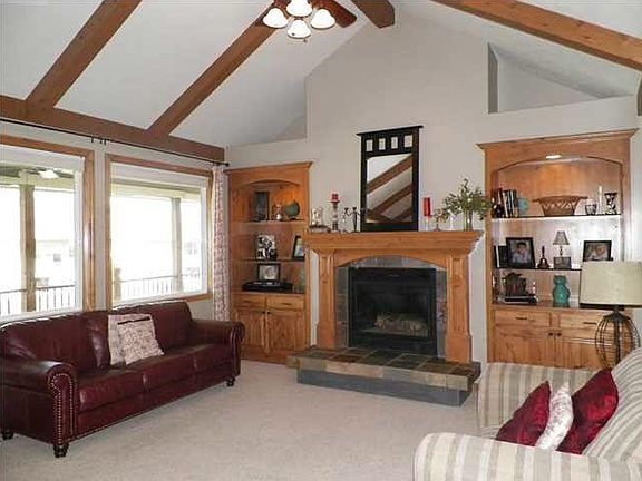Stunning home in Autumn Ridge. Unique features throughout! Beautiful wood beamed ceilings in the great room with fireplace that are open to the kitchen complete with eating bar/island. So much cabinet space! Pull outs and showcase glass cabinets. Kitchen has hard wood floors. The master bedroom has raised ceilings and private access to the covered deck. Bath complete with jetted tub, over sized shower and double sinks. Built in shelving and storage in the walk in closet. Basement is view out. Nice landscaping, complete with sprinkler system and irrigation well. Covered deck stretches the length of the house.