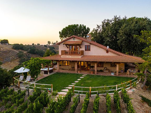 Watch the VIDEOS! Escape the crowds and feel like you're a world away. Located just a 2-hour drive North of LA. Enjoy world class vineyards, restaurants and wineries. Private gated drive leads you to this beautifully remodeled Villa at the top of the ridge. Wide covered verandas provide the ideal space for relaxing and unwinding, or for wine country entertaining, while enjoying the breathtaking Valley views. So many peaceful destination locations on this charming property, from the shady lawns under the oaks in the tree swing, to the fire pit lounge nestled in the vines of the boutique vineyard, to the spa under the stars. Well-designed 4 bedrooms, 3 bath home with views in all directions and a layout that provides privacy for all. Fenced pastures, vegetable garden & deeded riding trails